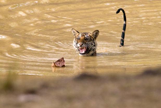 A 22-month-old female scaredy cat tiger appeared to get the shock of her young life when she encountered a dead leaf floating on a pool of water in the Bandhavgarh National Park, India. Clearly unusure about just what was approaching her, the partially submerged youngster’s tail shot up in the air and with teeth bared she let out her most fearsome growl – all in an effort to scare the humble leaf away.