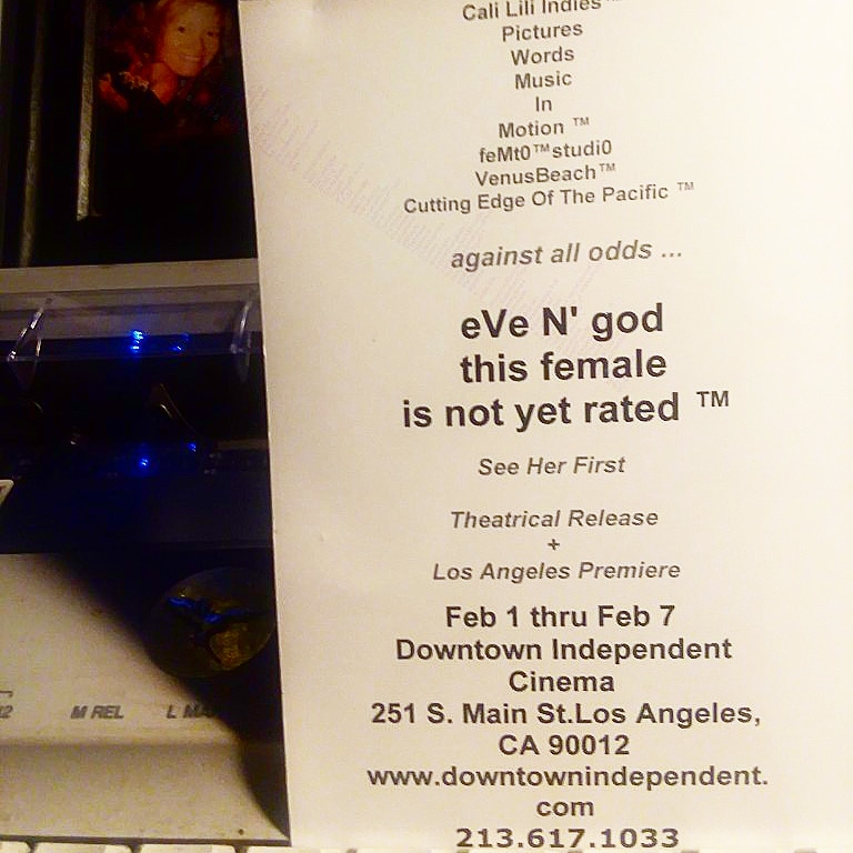 'eVe N'god this female is not yet rated ™ ' is perhaps, the first ( or one of the first ) production of it's kind : a theatrical feature length motion picture, in which the technical production roles employed only women during principal photography. She began pre-pre-production on this "fempoword™" project in 2010, including rehearsal footage.