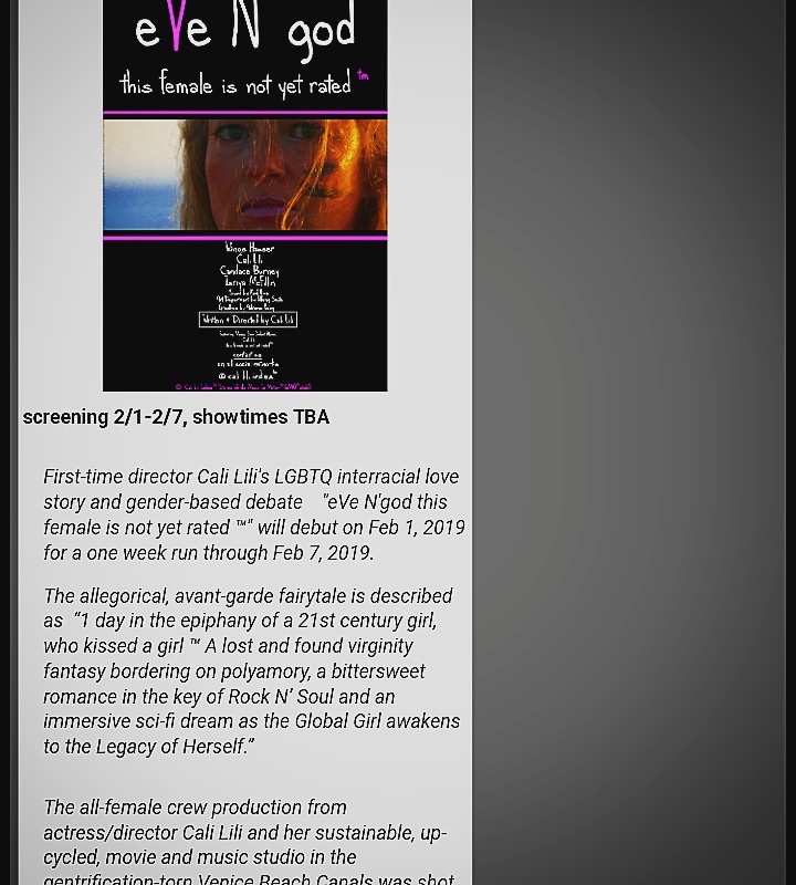 'eVe N'god this female is not yet rated ™ ' is perhaps, the first ( or one of the first ) production of it's kind : a theatrical feature length motion picture, in which the technical production roles employed only women during principal photography. She began pre-pre-production on this "fempoword™" project in 2010, including rehearsal footage.