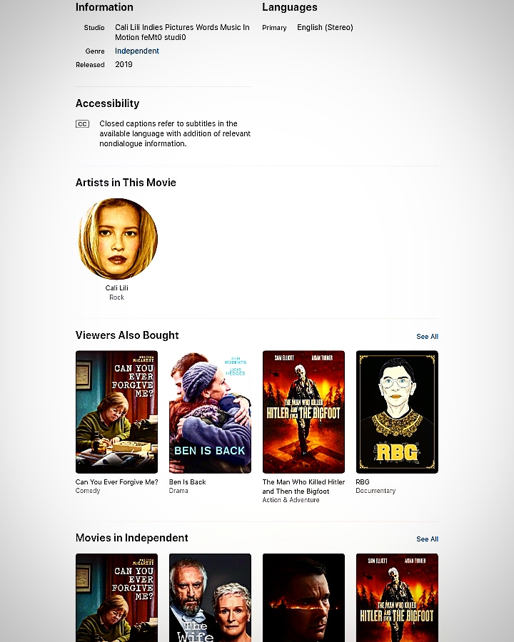 You can see Cali's recent Indie Motion Picture Release on Apple Movies, Vimeo, Amazon and Google Play and you can hear the Soundtrack / Debut Album on Apple Music and everywhere music is streamed. Cali and her team appreciate your support!