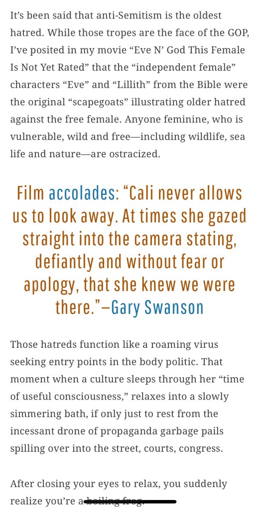 Cali adores being an actor and takes that craft very seriously, but found herself turning down 3 acting offers, that she felt were disempowering to women, in order to “turn up” what she calls fempower (TM) by scraping together “half a shoestring budget” to build her “green” “off-grid,” upcycled “floating” “surfshack” feMt0 (TM) studi0 at the Venice Beach Canals in Los Angeles, California where she makes “Signature” auteur Motion Pictures, Albums and Books, with “ToyBoxTechnologies” (TM) “HandMade2MakeADifference” (TM).