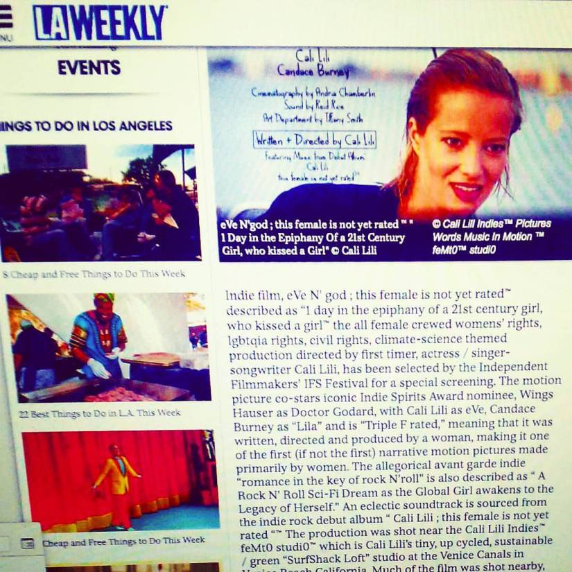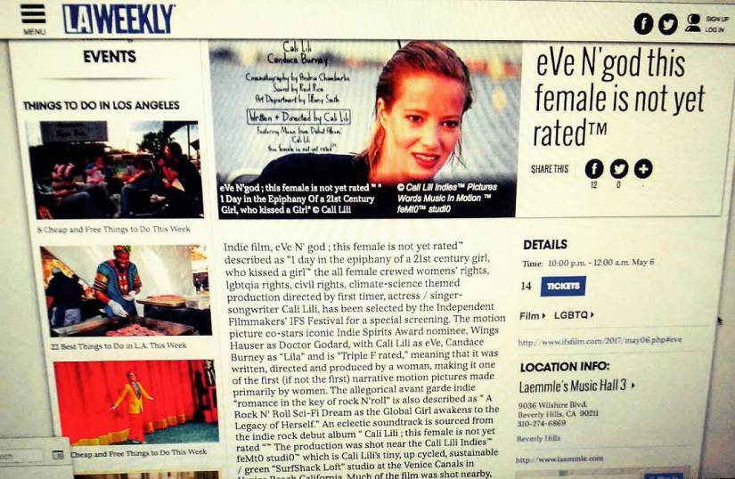 Climate Indie film eVe N’ god ; this female is not yet rated™ described as “1 day in the epiphany of a 21st century girl, who kissed a girl™ the all female crewed womens’ rights lgbtq rights civil rights themed production directed by first timer, / Cali Lili, has been selected by the Independent Filmmakers’ IFS Festival :